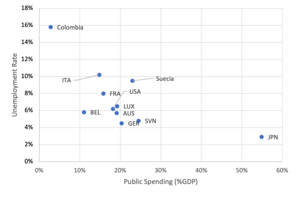 - The latest DANE report shows that the number of people in monetary poverty increased by more than three million people in 2020, which many commentators attribute to the pandemic. However, this is not the case as it was not a natural phenomenon, and the policies of previous governments aggravated its consequences. Austerity and sound finance policies, promoted and supported by the supposed consensus of economists, have damaged the economy by restricting effective demand. Poverty and unemployment are of great concern (especially for youth and women); as such are a product of austerity measures that hurt the majority of the population. Figure 1 contrasts the size of public spending to address COVID-19, an embarrassing 2.8% of GDP in Colombia, with unemployment rates in some OECD countries, as of February 2021.