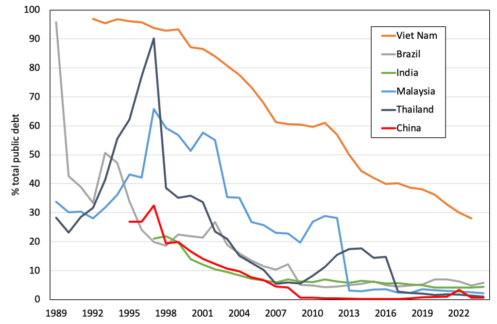 In contrast, domestic public ‘debt’, as seen above, is the same as domestic wealth. Where the government sells bonds to private investors, it can always pay the principal and interest without default or exchange rate risks. Most of the more successful developing countries have thus reduced the share of foreign currency debt in their total borrowing over time (Figure 4).