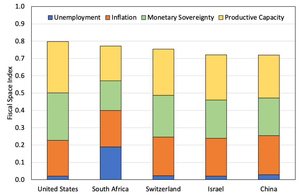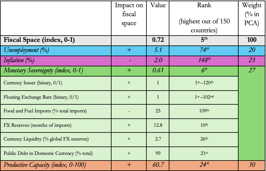 To take a concrete example, let’s look at China. As Figure 6 shows, China is the country with the fifth highest fiscal space according to our estimates (for 2022). Table 2 breaks China’s record down further, showing how it scores highly on components that positively impact fiscal space and lowly for components that negatively impact fiscal space. The country has recognized the importance of exercising its sovereignty over domestic policy, meaning it has made institutional choices that has given it the fiscal space to attain its economic objectives – it issues its own currency, it operates a (managed) flexible exchange rate (aided by a tightly regulated capital account), it prioritizes issuing public debt in its domestic currency, it targets a high utilization of resources and a high domestic productive capacity that forgoes excessive dependence on food and fuel imports. There is a blueprint in this record, one in which all the determinants of fiscal space are taken seriously.[1]
